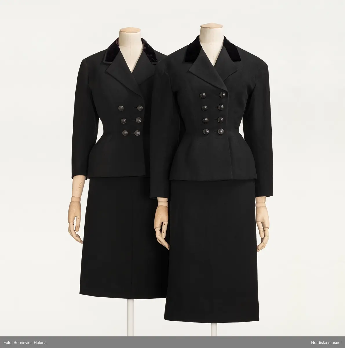 Två dräkter monterade på docka. Balenciagadräkt som blev en bästsäljare på NK:s Franska damskrädderi. Den dubbelknäppta med sex knappar beställdes av Ingrid Bergom Larsson född Bovin (1912-1988), levererad december 1951. Premiärdansösen Ellen Rasch (1920-2015) beställde den med åtta knappar, levererad januari 1952.