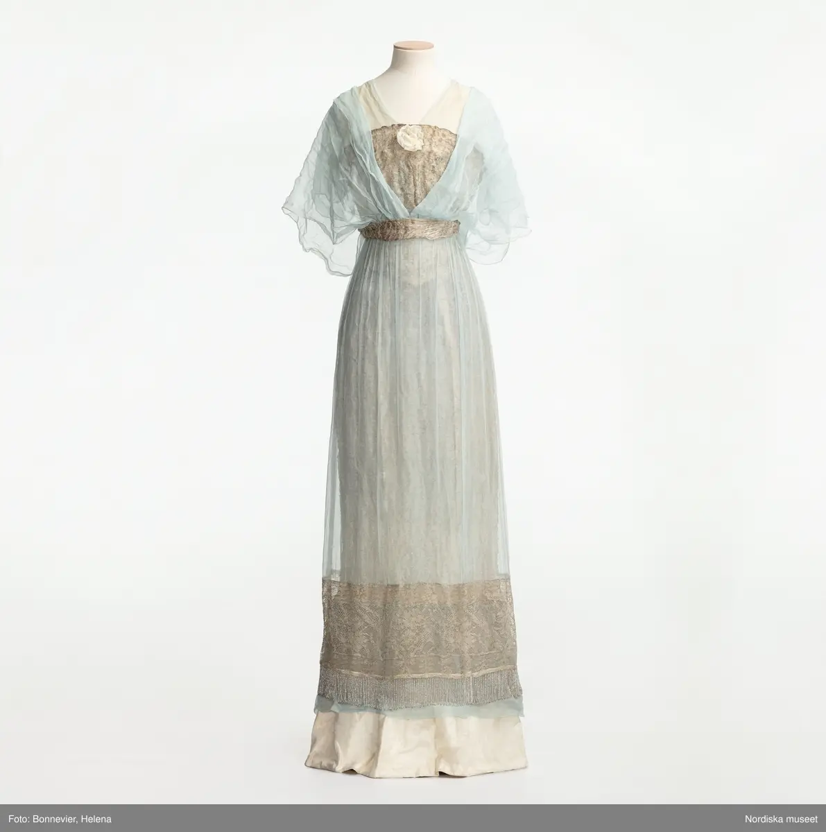 Klänning monterad på docka. NK:s Franska damskrädderi. Helskuren slank aftonklänning med hög empireinfluerad midja. Skir ljusblå chiffong över en underklänning av silverlame. Silverskärp och bred bård av silverspets med pärlfrans på kjolen. Beställare okänd, leverans 1910.