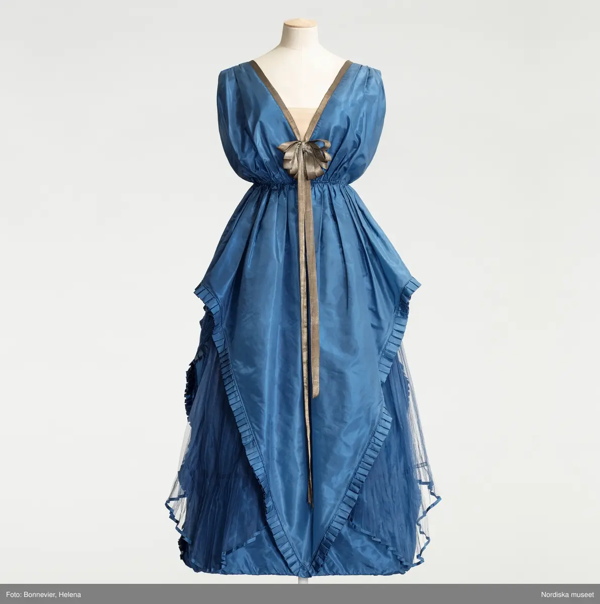 Blå, empireskuren av sidentaft och plisserad chiffong med dekorativa guldband. Beställd av Dora Lamm född Upmark (1880-1959). Levererad 1919, tidstypisk, inspirerad av Paul Poiret.