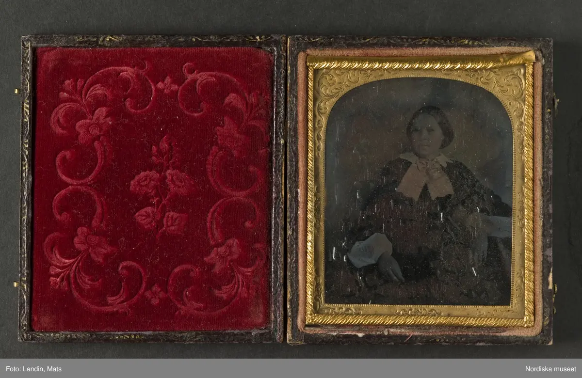 Ambrotyp, handkolorerad, i läderetui. På framsidan urna med blommor inom medaljong, i relief. Passepartout och kantlist i mönsterpressad gulmetall.