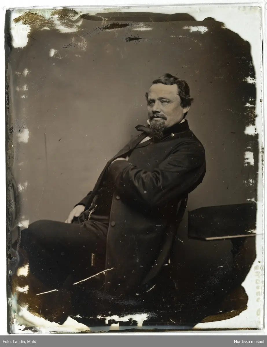 Porträtt av man, sittande med vänstra handen stucken inannför rocken. Ambrotyp. Skall enligt givaren föreställa en sjökapten Bergman eller kapten Sandin. Nordiska museet inv.nr 249250.
