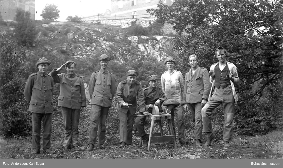 Ett antal män uppställda sida vid sida bakom en handvevad slipsten i träställning, Bohusläns regemente I 17