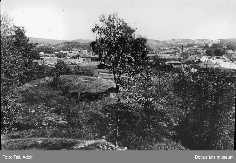 Enligt notering: "Trol Ragnhildsholmens Ruin Fäste Med Kungälv i Bakgrunden"