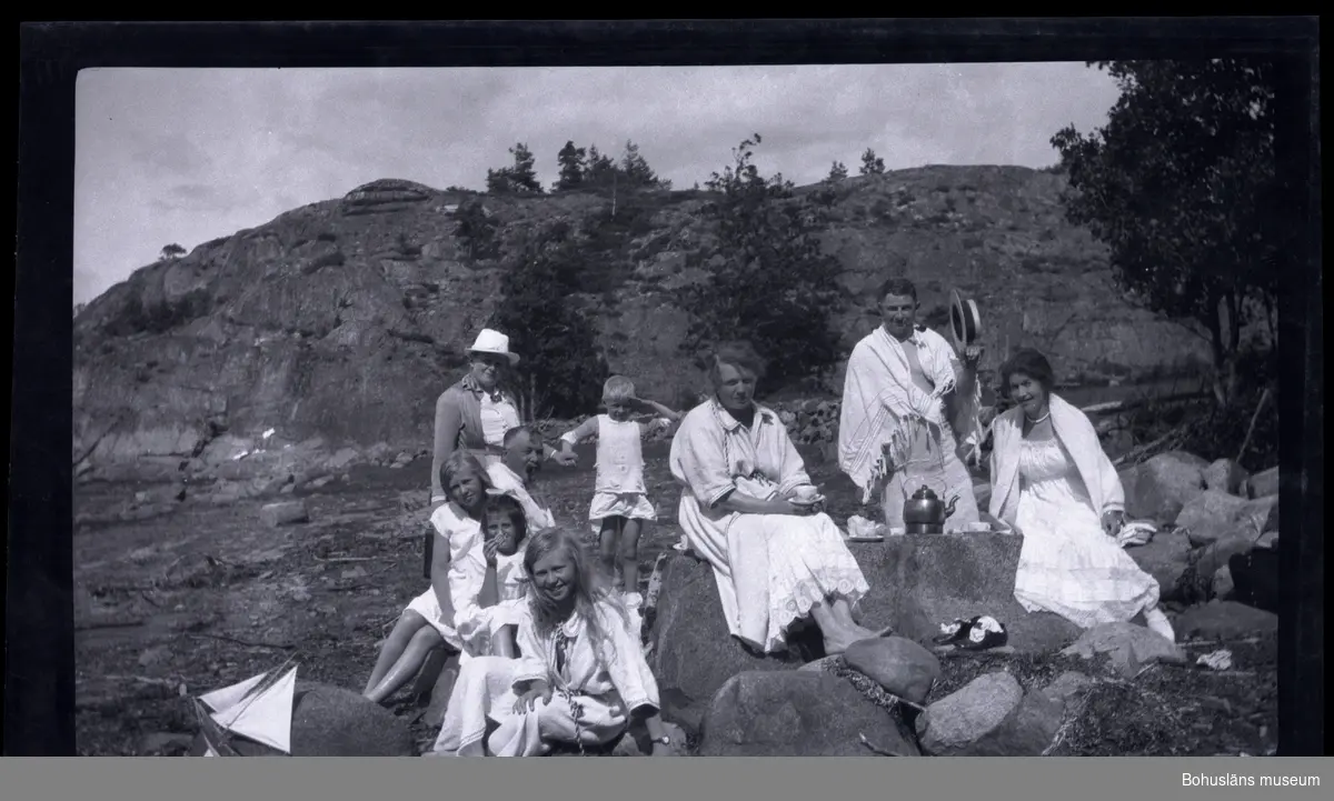 Nio personer samlade vid en stening strandkant med kanna och koppar uppdukade på en sten.