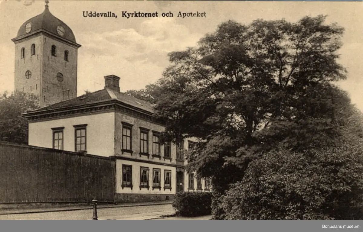 Tryckt text på bildens framsida: Uddevalla, Kyrktornet och Apoteket