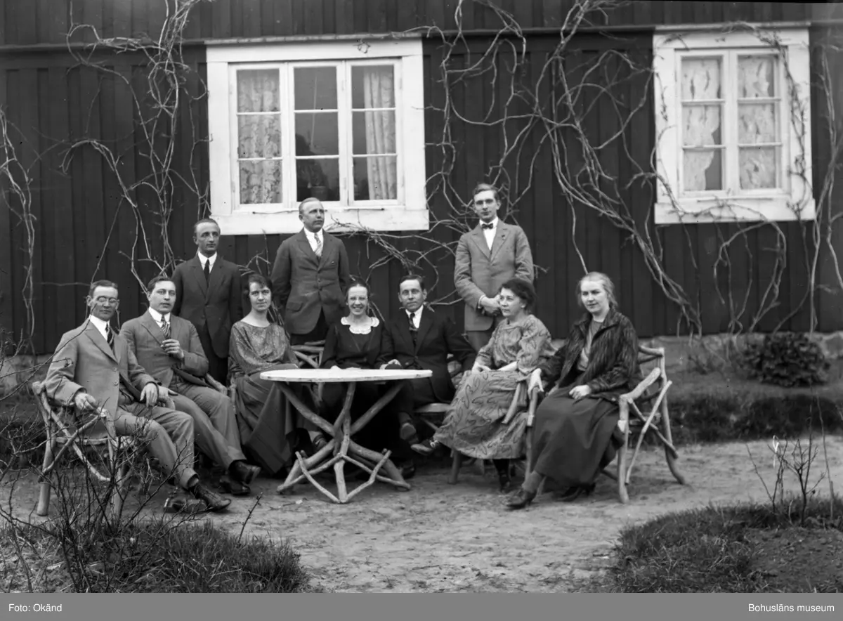 Tio personer samlade r framför ett hus vid en trädgårdsgrupp.