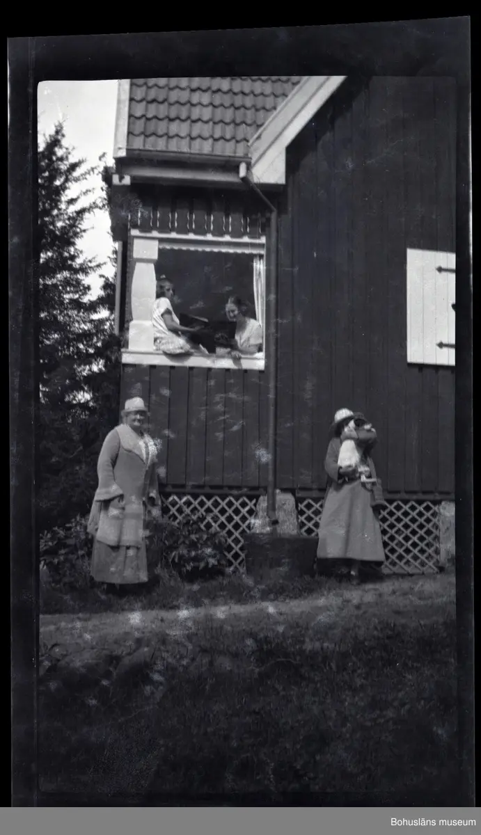 Två personer ståendes på en veranda med en bok i händerna. Två personer står framför huset, den ena omfamnar en hund.
