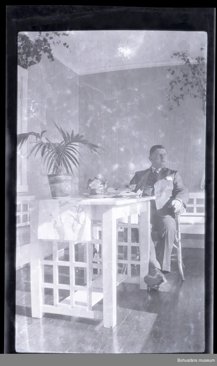 En person sittandes framför ett uppdukat fikabord på en veranda.