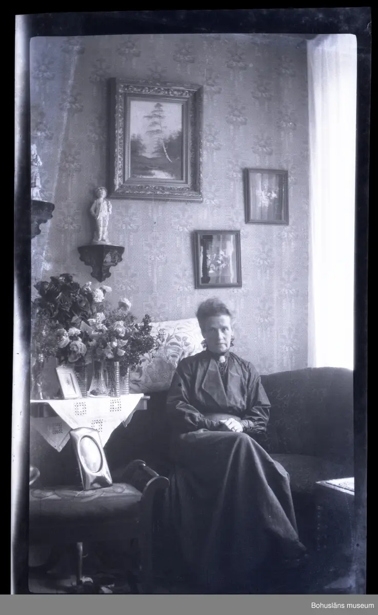 En person sittandes i en soffa bredvid ett bord med blommor.