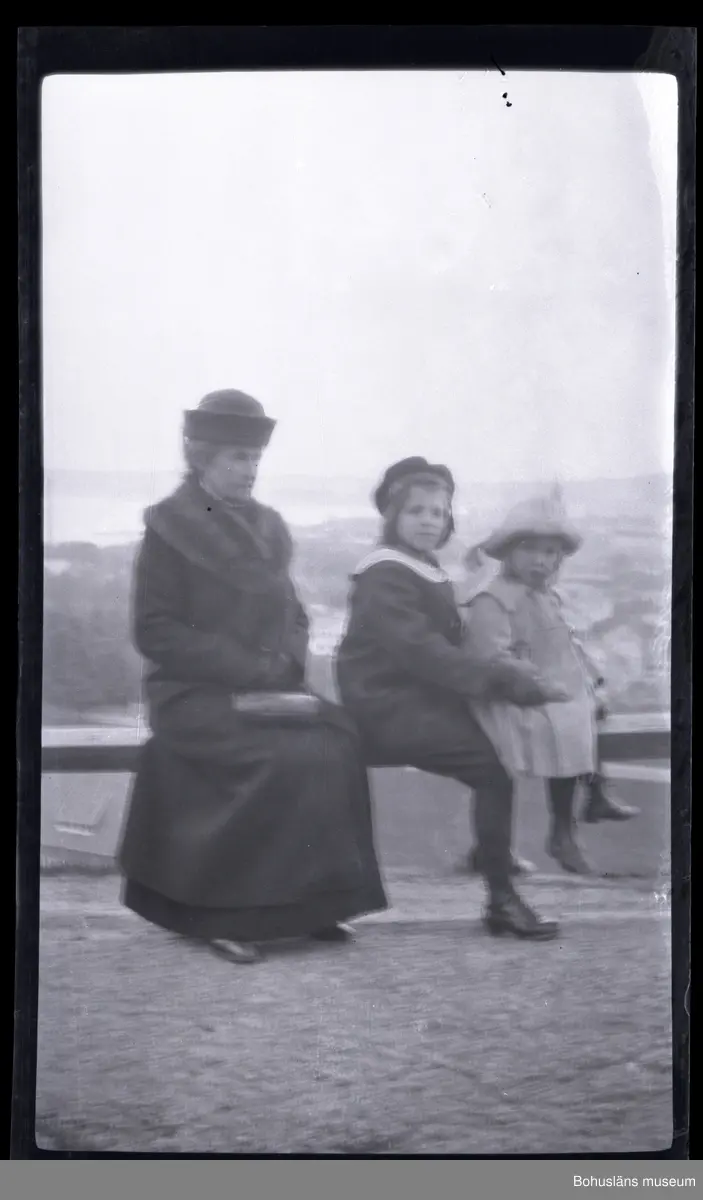 En vinterklädd kvinna och två barn sittandes på en bänk.