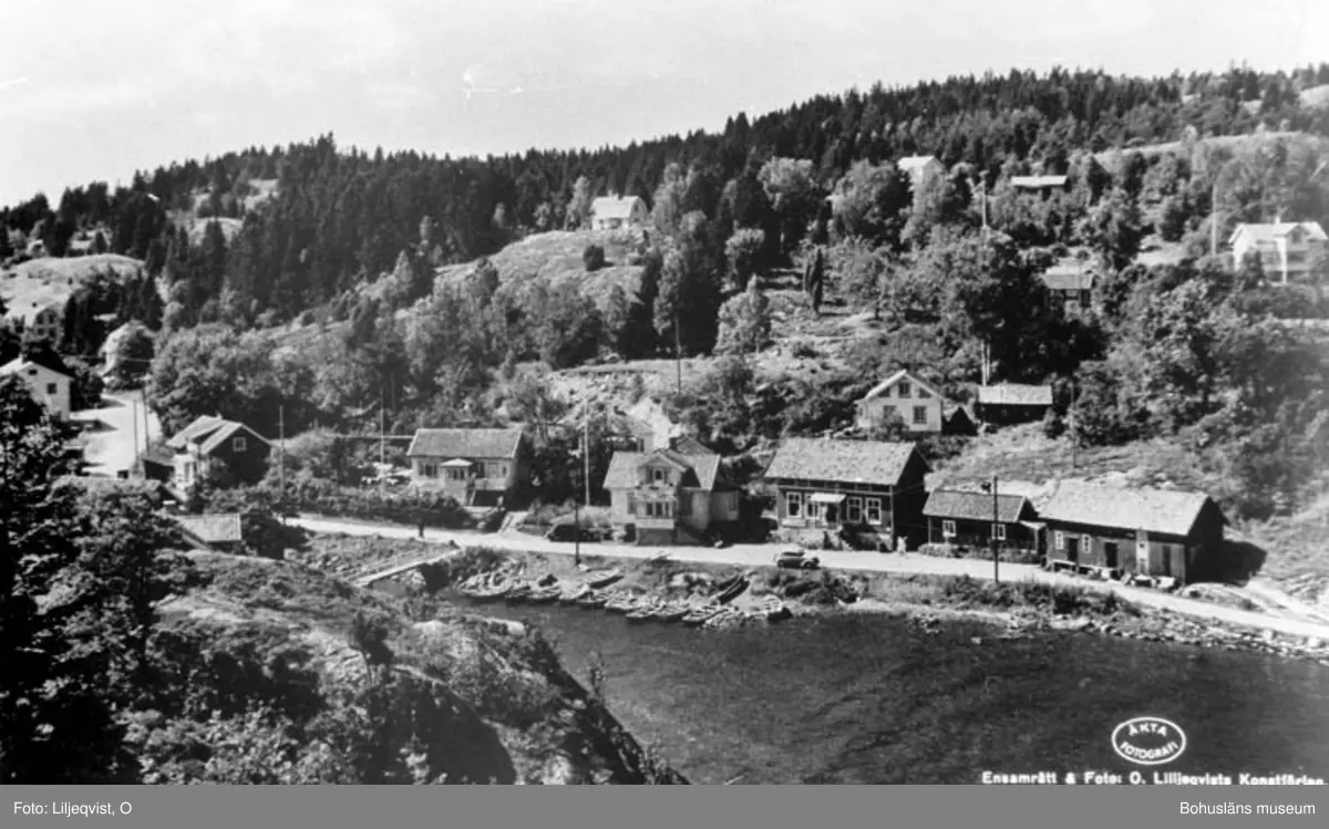 Enligt text på baksidan av fotot: "Slussen, Kleva-Orust ca 1950. Huset längst till vänster - vitt - Konsum - affären upphörde 1969. Huset med bilen framför var affär. Det brann ner 1959. Bakom Reuterbergs hus byggt 1901".