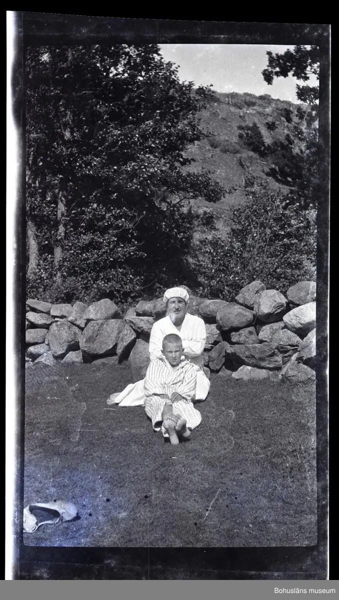 Två personer i badrockar sittandes i gräset framför en stenmur.