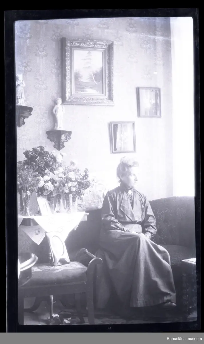 En person sittandes i en soffa bredvid ett bord med blommor.