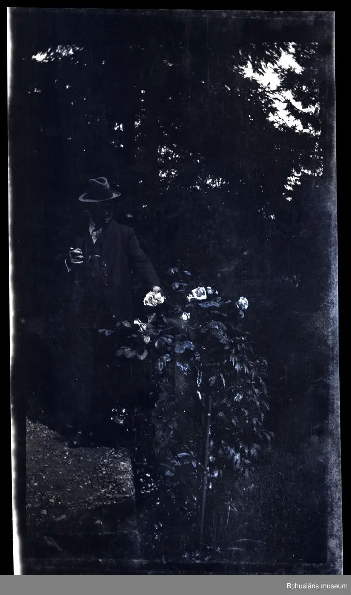 En person vid en rosbuske.