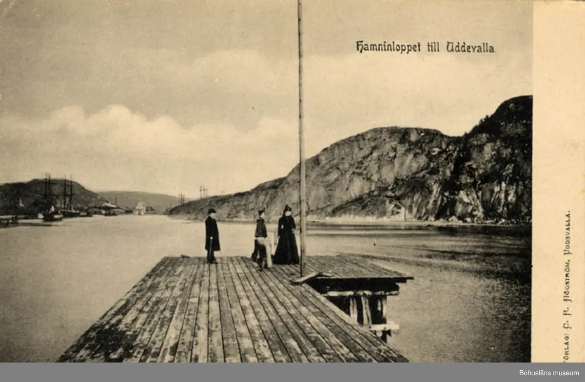 Tryckt text på bildens framsida: Hamninloppet till Uddevalla.