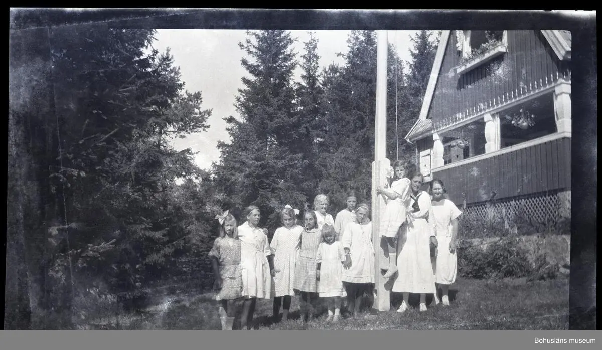 Elva ungdomar samlade vid en flaggstång i en trädgård.