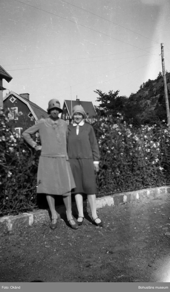 Två kvinnor klädda i klänning och hatt står framför en blommande rabatt.