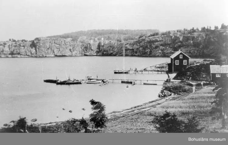 Enligt text på fotots baksida: "Slussen, Orust. I bakgrunden Runnsberget med en kutter? i Wannen. Den tillhörde några bröder fr Miggelin. Byggnaden är konservfabrik (1928-1932) Numera (1992) Slussen Pensionat".
