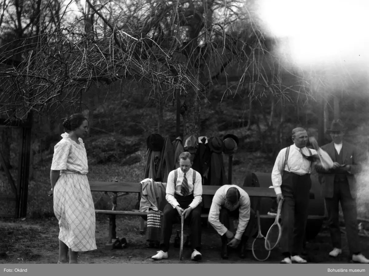Tre personer gör sig redo att spela tennis med två åskådare.