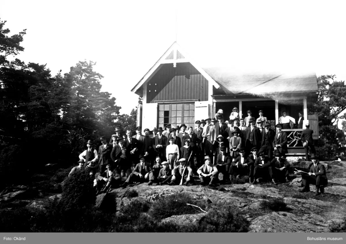 En stor grupp människor samlade framför ett hus. Troligen Skytteföreningens stuga.