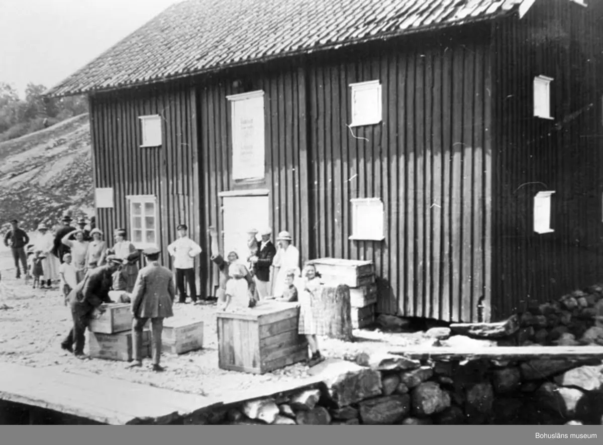Enligt text på fotots baksida: "Ångbåtsbryggan Slussen ca 1925. Vid lådan Oscar i Kockhed och trol.vis Valfrid Aurell. Frfr fönstret Johanna Wetterström, Frfr, stora dörren Robert Hansson med sonen Roger. Vid sidan av Johanna W. flickorna Olsson = Svea & Göta Aurell. Byggnaden var Hjalmar Aurells magasin. Från 50-talet båtbyggeri.".
