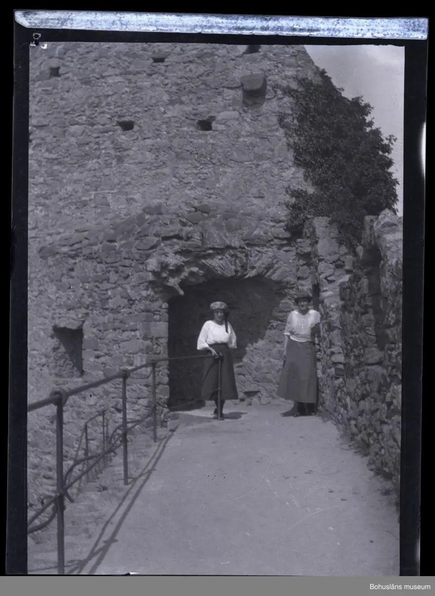 Två personer framför en ruin.