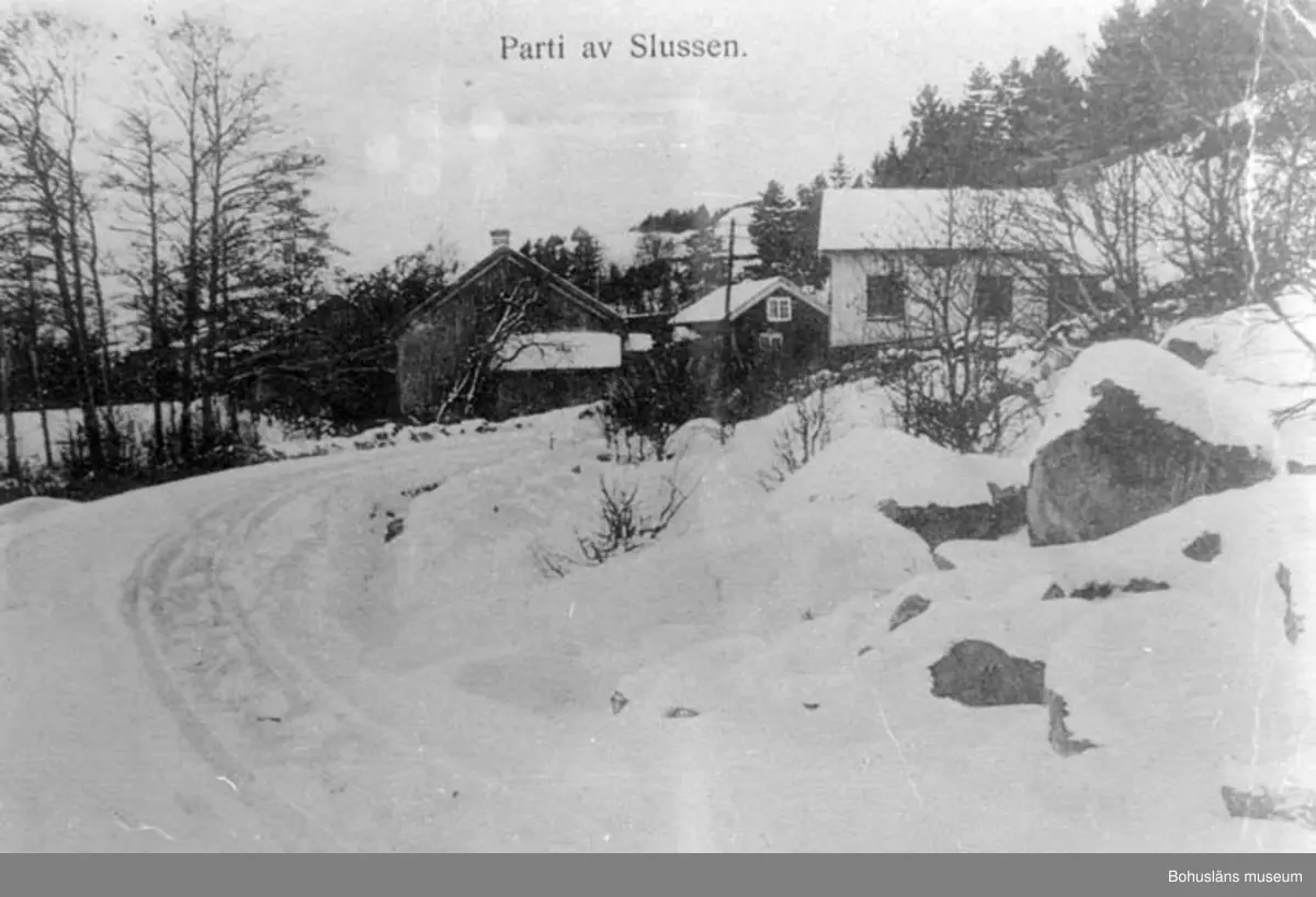 Enligt text på fotots baksida: "Slussen ca 1920 (Orust). Fr.v. la'gård [ladugård]. gästgiveri revs 1946, Abrahamssons drängestöva, revs 1936 och t.h. "Kaptens hus".