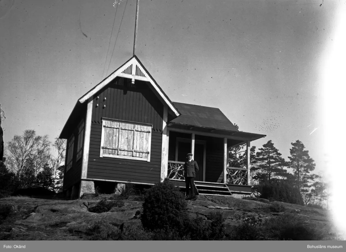 En person framför ett hus. Troligen Skytteföreningens stuga.