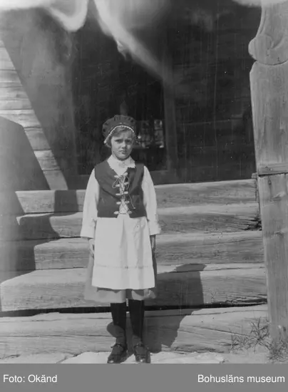 "Märta Emanuelsson i Bohusdräkt sydd av Elsa Peterson".