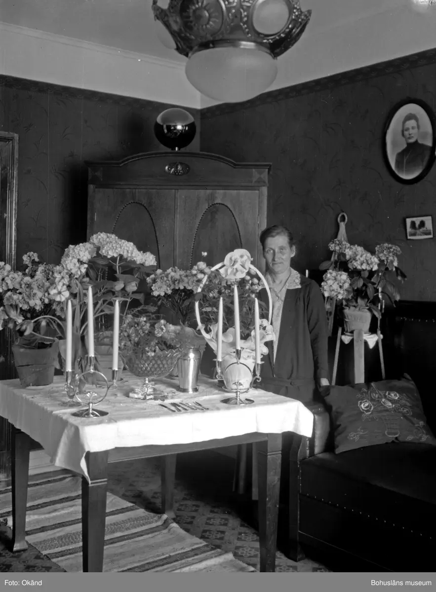 Person ståendes bredvid ett bord med blommor.