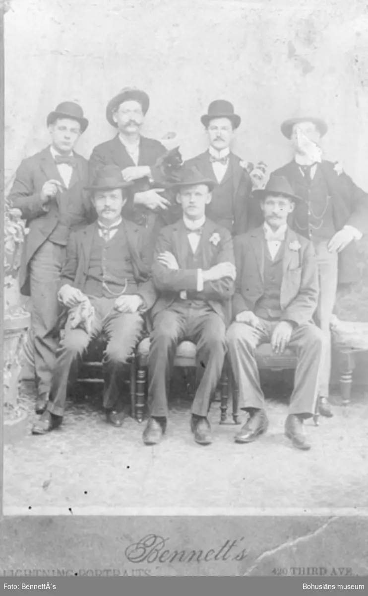 Text på kortets baksida: "Utvandrade till USA. Längst fram t.v. sitter Johan Edvard, son till Johannes Berntsson".