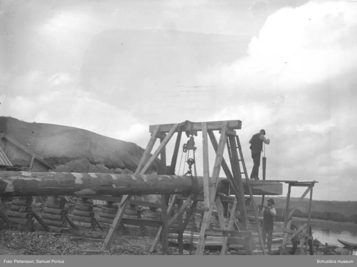 Text till bilden: "Sågning av mastfoten. Troligen i Uddevallatrakten".