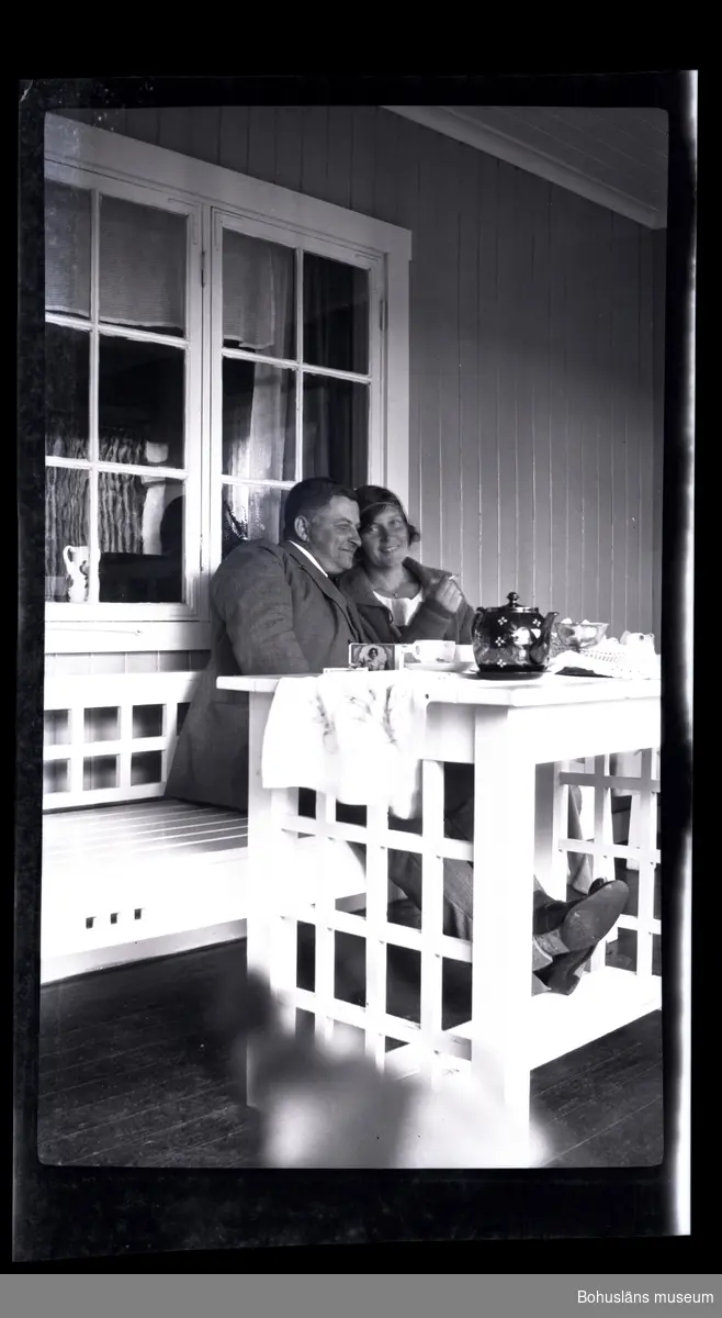 Två personer i en soffa vid ett uppdukat bord på en veranda.