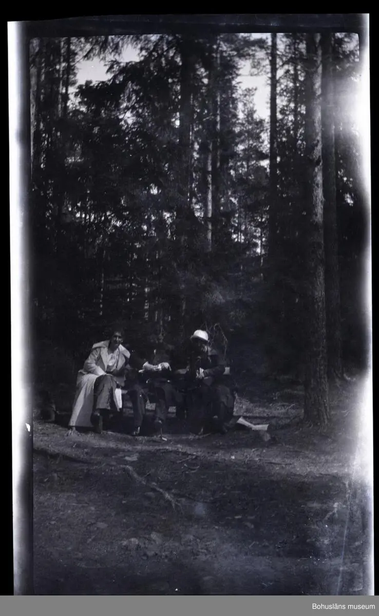Tre personner sittandes på en bänk vid skogsbrynet.