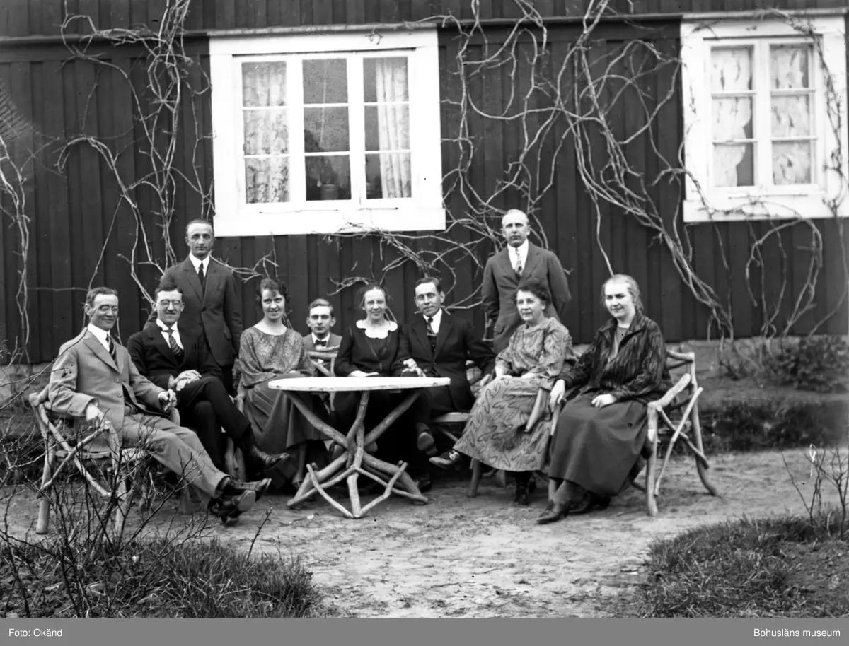 Tio personer samlade r framför ett hus vid en trädgårdsgrupp.
