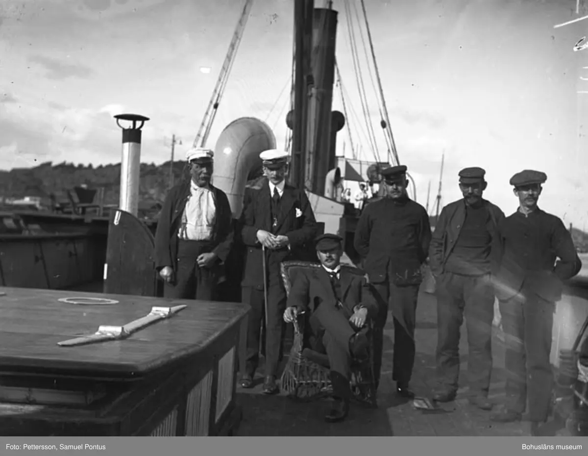 Text till bilden: "Däckbild på Ångaren. Två från vänster S. P. Pettersson. I stolen ev kapten Thorburn".