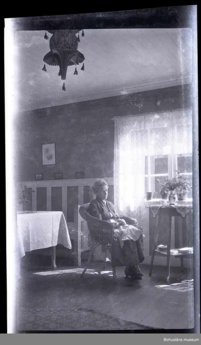 En person sittandes i en fåtölj med ett handarbete i knät.