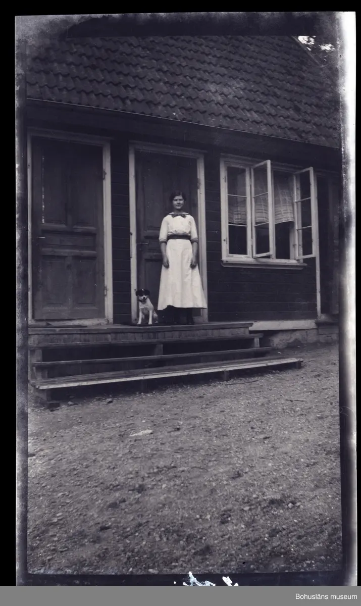 En flicka och en hund ståendes på en trapp framför en ytterdörr.