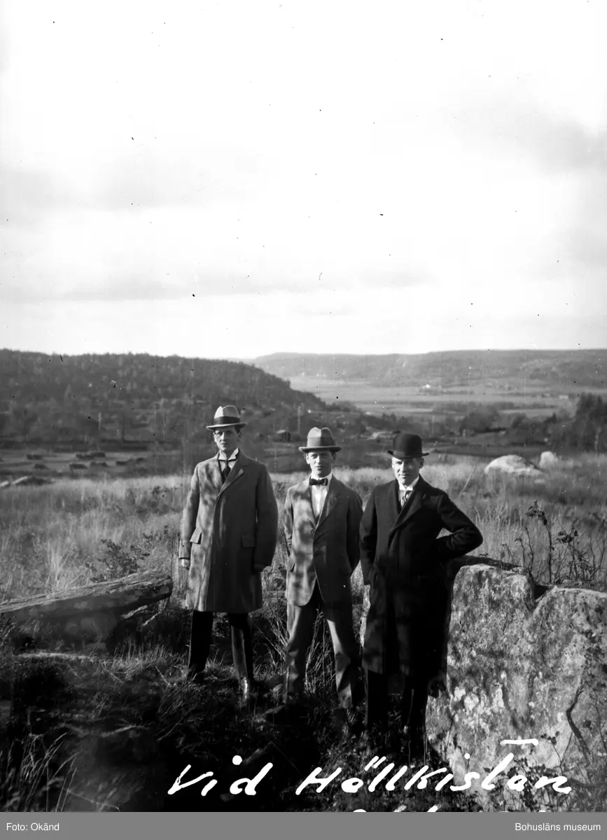 Tre personer ståendes vid en hällkista. Enligt notering på negativet: "Vid Hällkistan okt. 1920".