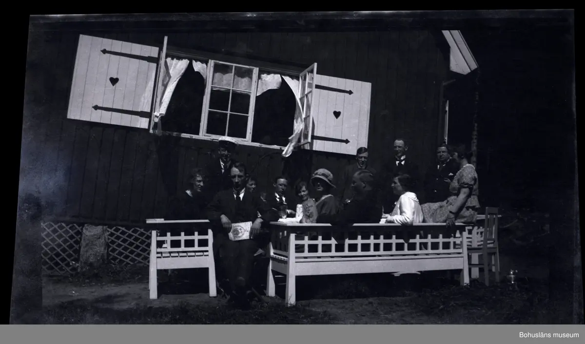 En grupp personer i en trädgårdsgrupp framför en husfasad.