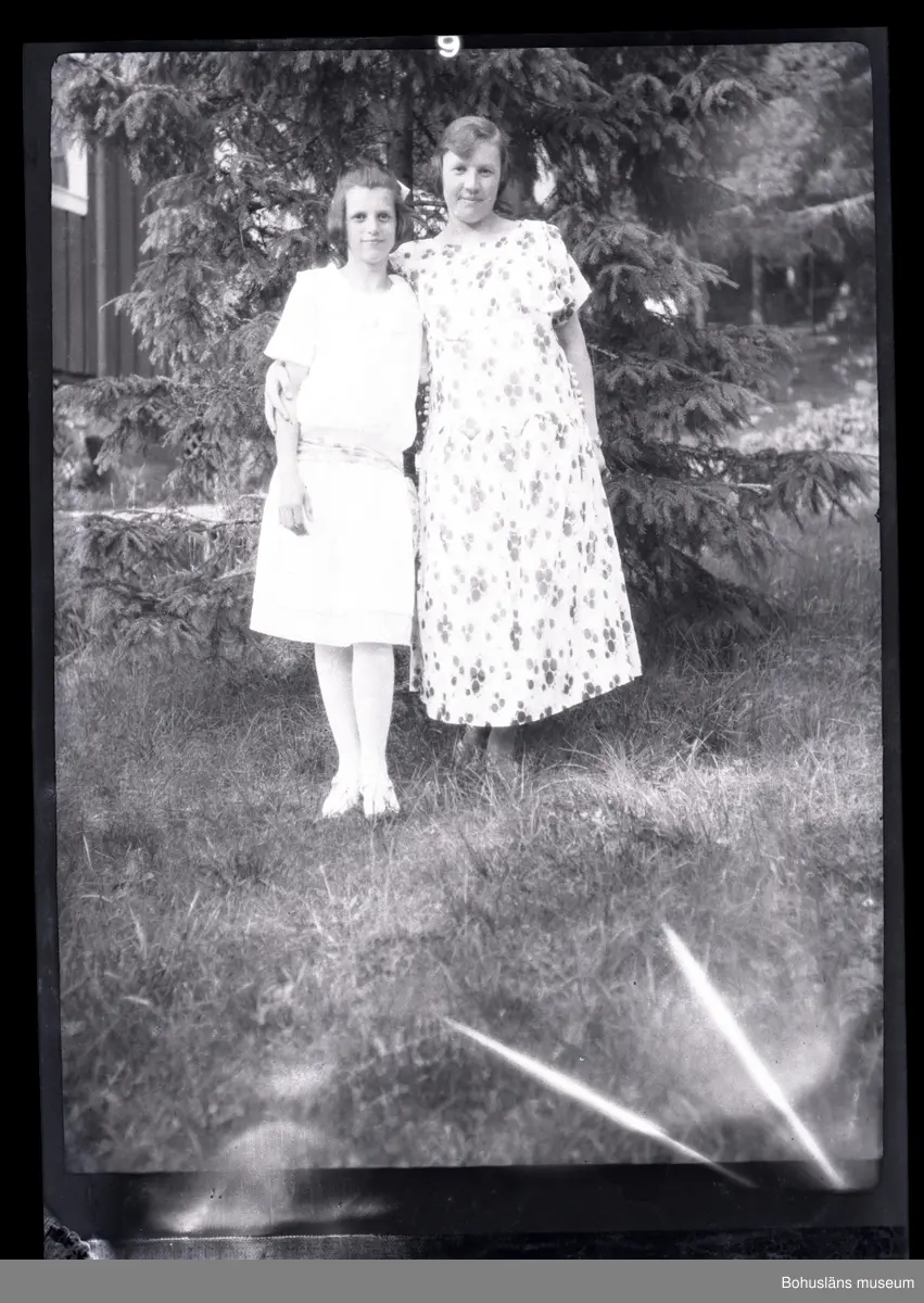 Två flickor i en trädgård.