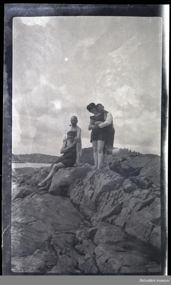 Fyra personer i badkläder på klippor.