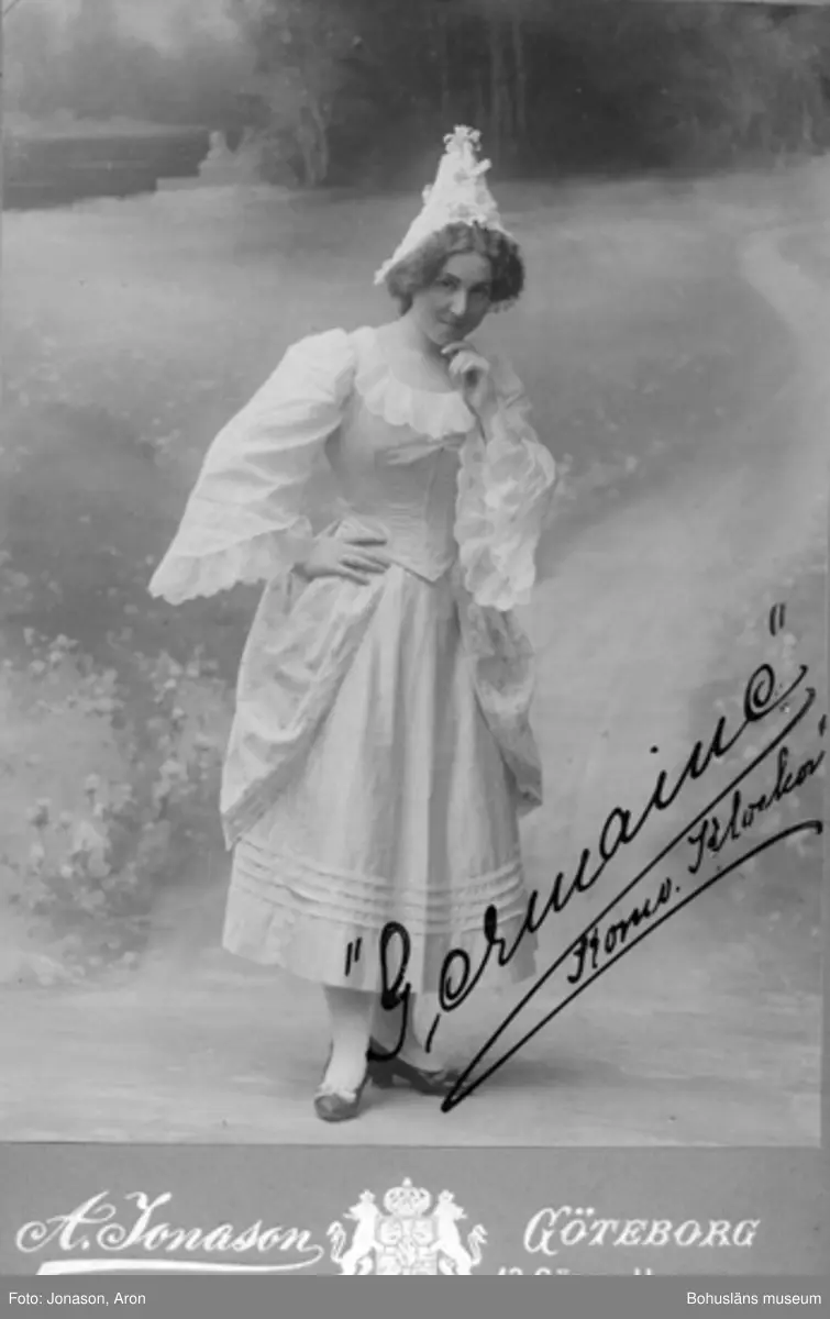 Enligt text på fotot: "Frkn Hilda Mankell senare gift med amaunens Lindberg i Sthlm. Har delat dublett i Gtbg, då hon var anställd vid Göteborgs Teater och debuterade som "Germaine" i Cornevilles klockor (tillhör Gerda W). Hennes bror är rektorn Bernhard Mankell Kusinerna: Tandl. Aug. Mankell Handl. i Konfektion do samt Ida".