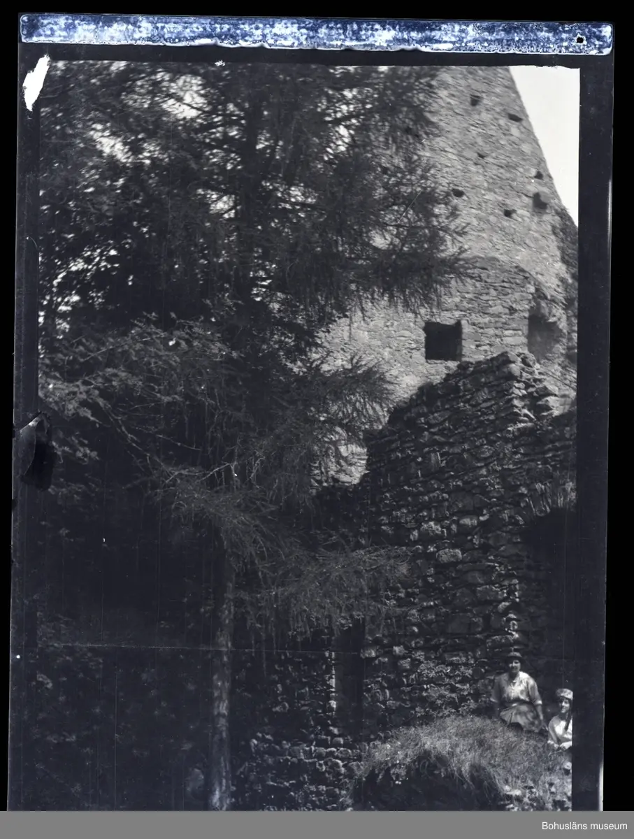 Två personer framför en ruin.