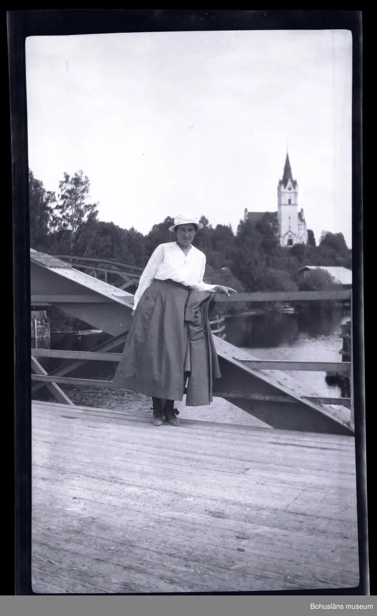 Person ståendes på en bro med en kyrka i bakgrunden.