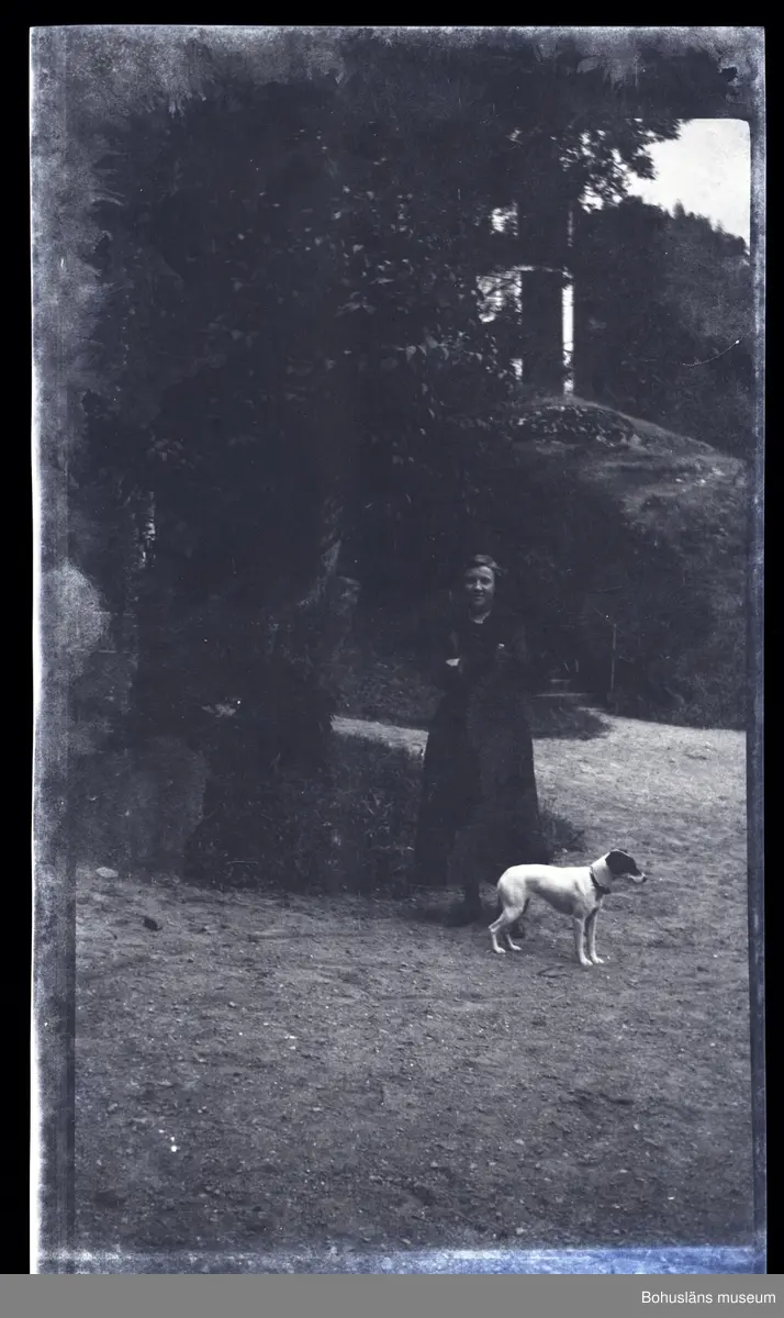 En person ståendes med en hund i en trädgård.