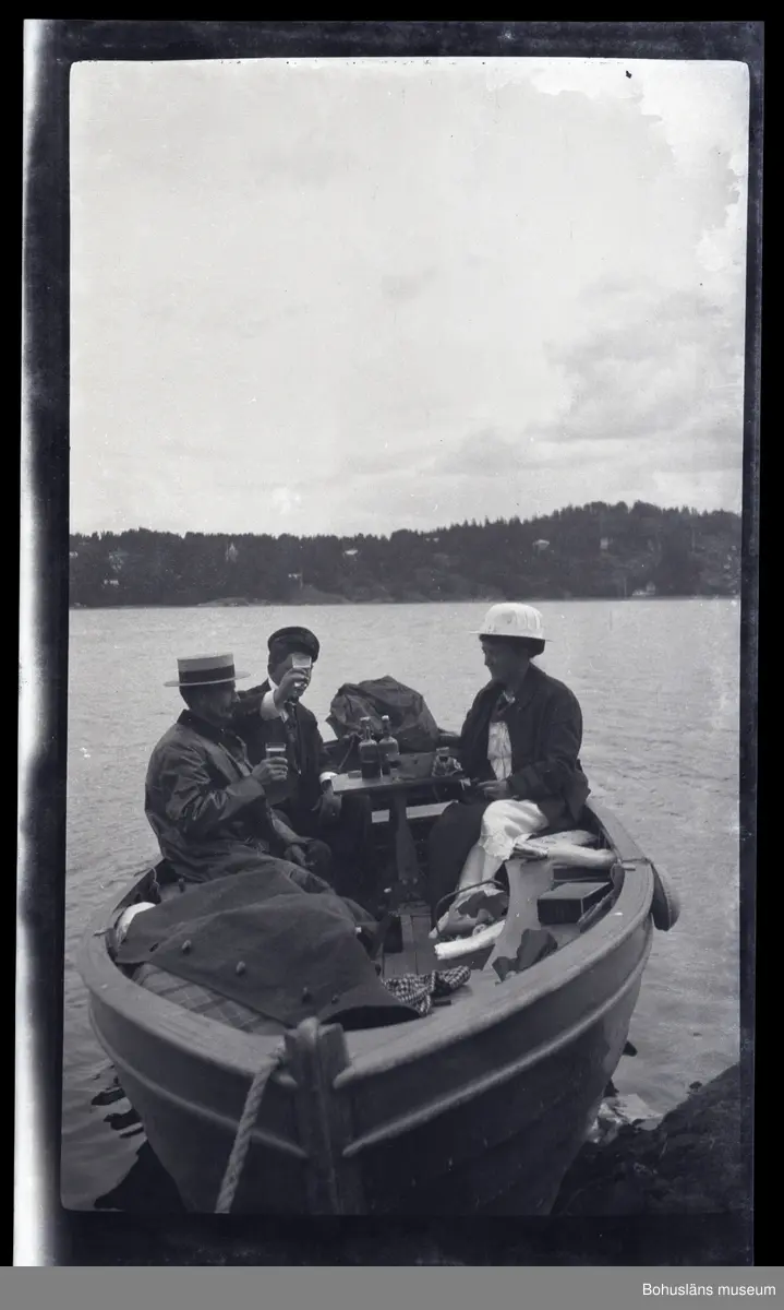 Tre personer skålar sittandes i en båt.