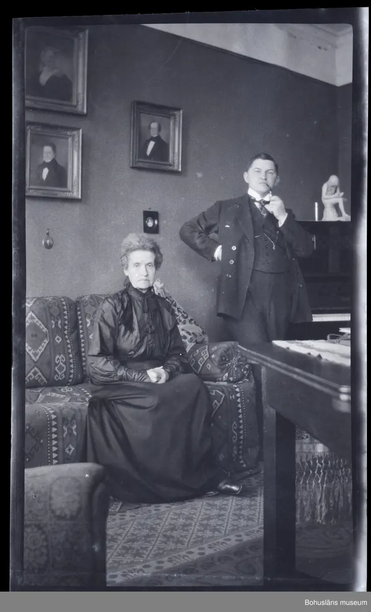 En dam sittandes i en soffa med en herre ståendes bredvid, rökandes en pipa.