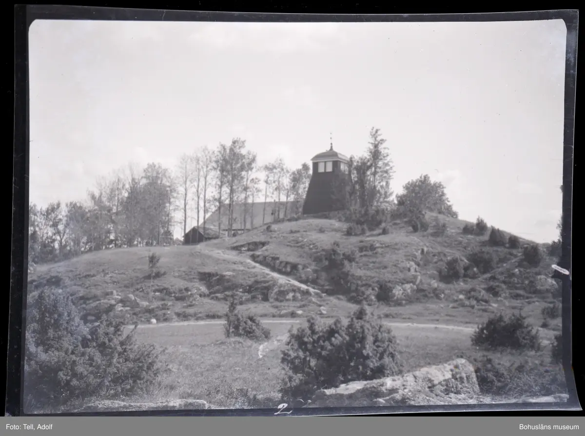 Byggnader på och bakom en kulle.