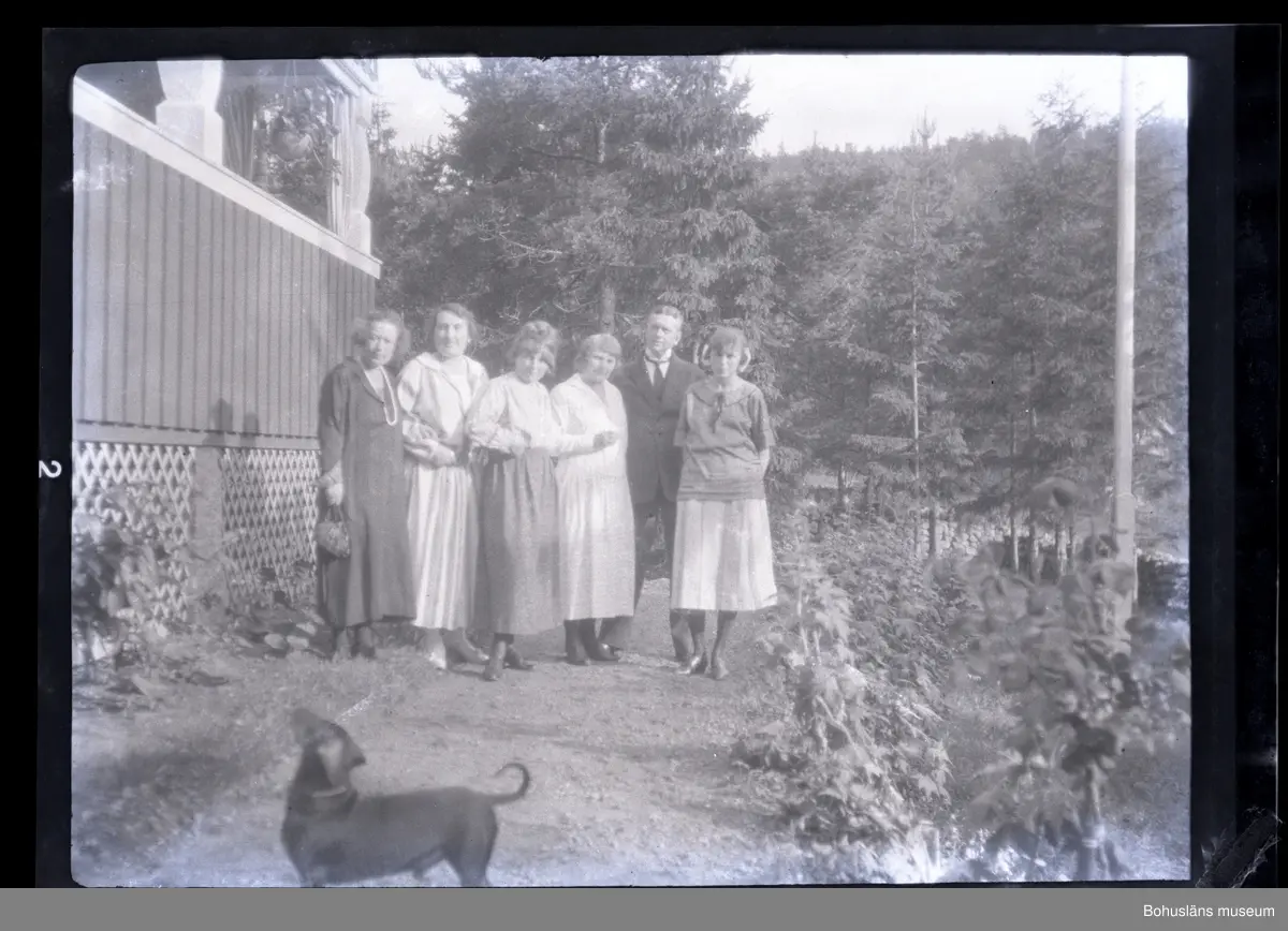 Sex personer står framför ett hus med skog omkring. En hund står i förgrunden.